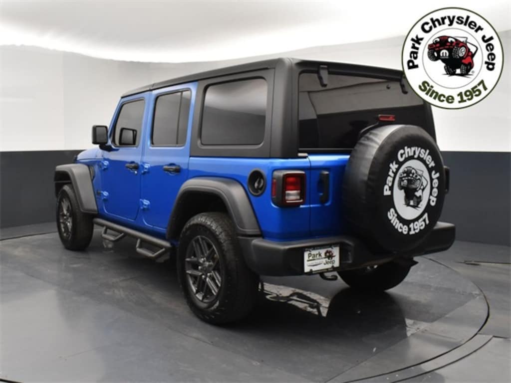 Our Accident Free, One Owner 2024 Jeep Wrangler Sport S 4 Door 4X4 is an authentic adventure machine with an unmistakable Hydro Blue Pearl design! Powered by a 3.6 Liter Pentastar V6 providing 285hp matched to an 8 Speed Automatic transmission so you can take on tough trails and win. The robust skid plates and Dana axles also help when you're mastering rugged terrain, and this Four Wheel Drive SUV sees nearly 24mpg on the highway. Our Wrangler is easy to recognize with its fog lamps, a fold-down Gorilla Glass windshield, removable soft top/doors, bold fender flares, alloy wheels, heated power mirrors, and body-color sport bar.